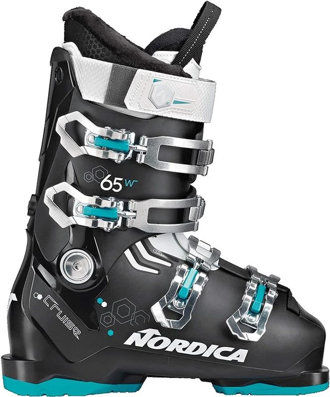 For emerging skiers and those looking for comfort and flexibility, there’s nothing better out there than the Nordica Cruise 65 women’s boots. For beginner and intermediate lady skiers who are looking for a cushy fit, a generous flex, and strong style, the Cruise 65 is an amazing place to be. Built with a 104-mm forefoot last, the boots are certainly on the wide side, and this will allow skiers and their feet to spread out and get the most out of the limited room that’s so often found in alpine ski boots. With more room on top of the foot and in the ankle area as well, the Cruise 65 is best for skiers with wider feet or for ladies who have had fit issues in the past. The Cruise 65 feels like a slipper for sure, but it also has some strong performance characteristics that are going to impress a lot of skiers. With a four-buckle overlap design, these boots look like and are constructed much like the high-end and race boots of Nordica’s line, just with softer plastics and wider shapes. But overall, with the buckles and power strap and dual hinge on the ankles, the basic frame and bones are just about the same. This will give skiers who are looking to progress and take their skills to the next level a huge advantage. If you like cruising around the groomers or if this is your first boot purchase, the Nordica Cruise 65 women’s ski boots are a great place to start.