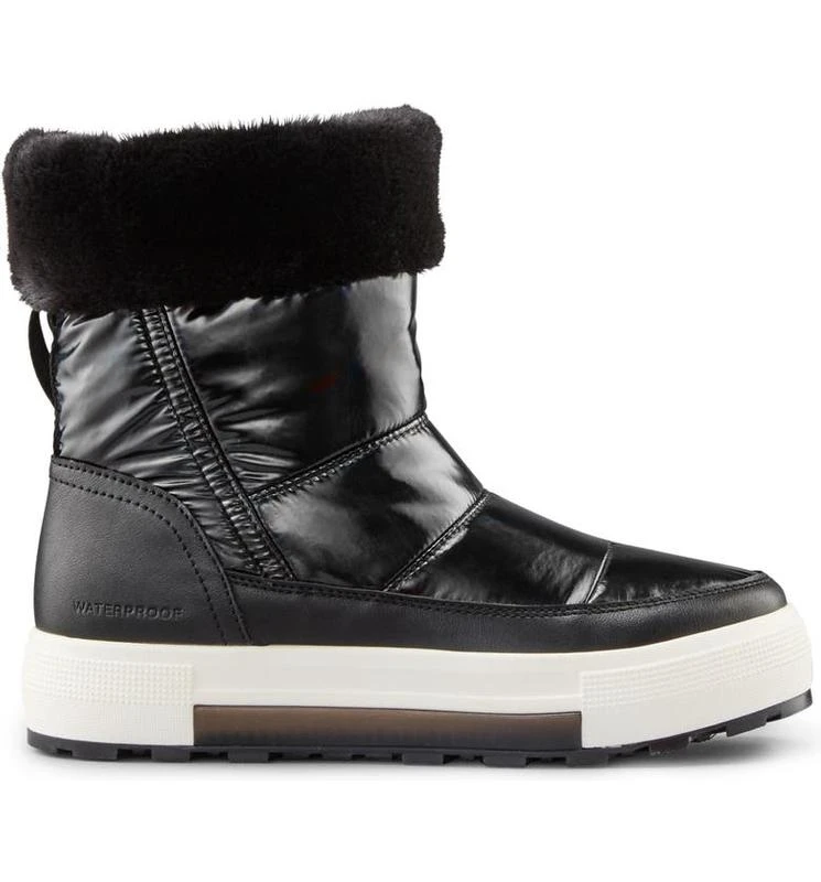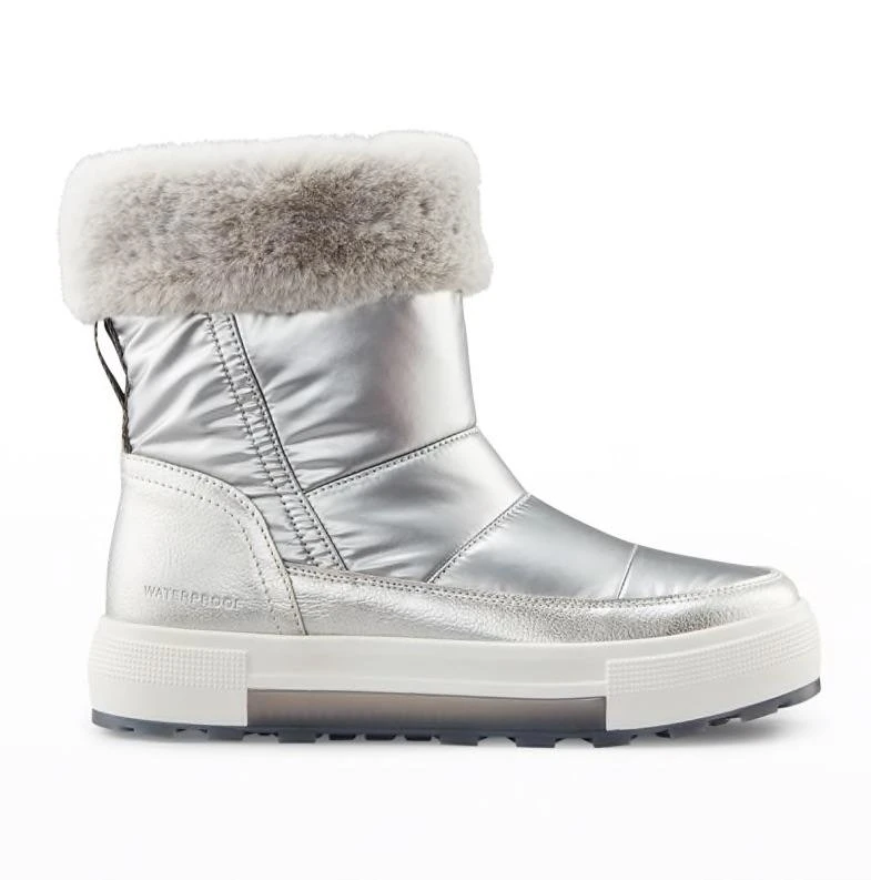Mid-height nylon pull-on boot with a padded shaft and quilt detail stitching. Faux fur collar. Rounded toe. Back pull loop. Lightweight Polyurethane cushion midsole with frosted Rubber outsole.