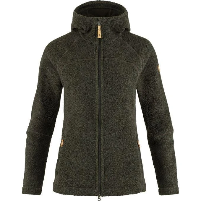 Wonderfully thick fleece in wool blend with fleece-lined hood and two side pockets. Attractive women’s cut with comfort fit.