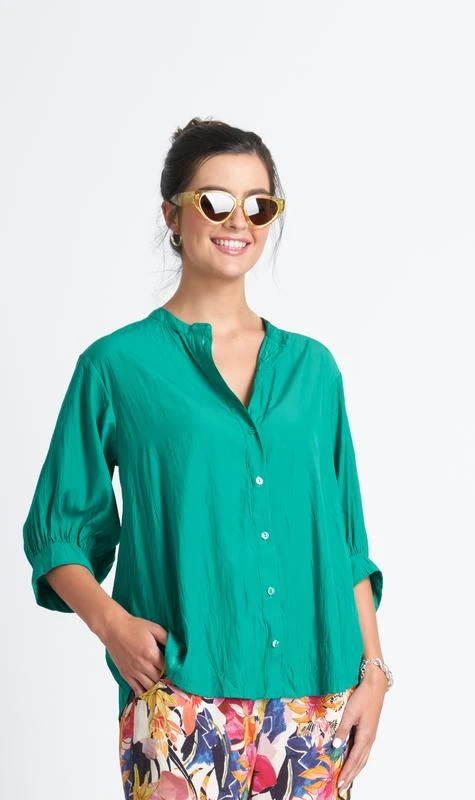 The Foil Don’t Make Fuss Blouse combines classic style with contemporary aesthetics. Crafted from crinkle effect polyester, it features a loose fit, simple scoop neckline, and button-down front for easy wearing. Its luxe matte finish in grasshopper green adds a modern touch to the design, while the elbow-length balloon sleeves and scooped high-low hemline provide a flattering silhouette.