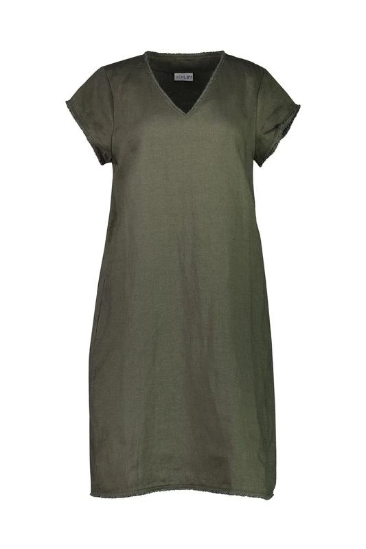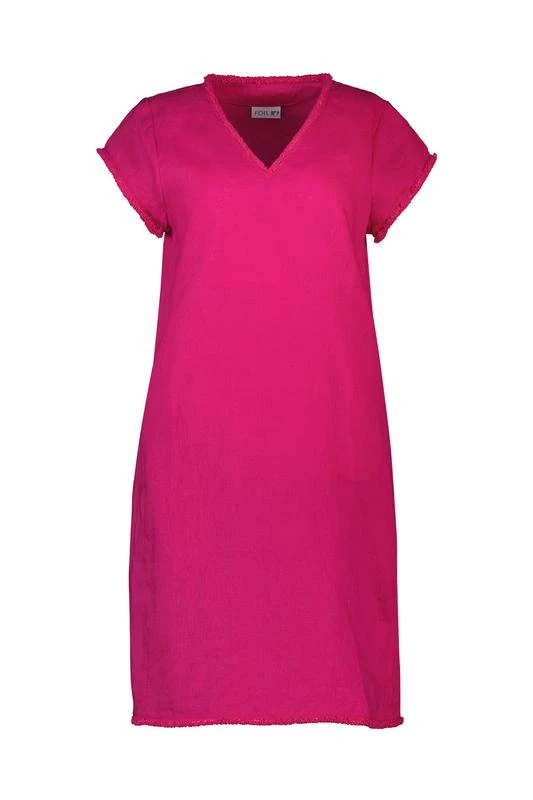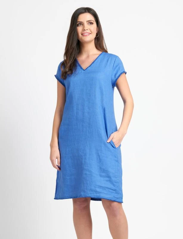 Foil Fringe Benefits BlueBell Dress. 100% linen, unlined, V neck with fringe detail, short sleeves with fringe detail, fringe detail at hem, in seam pockets. gentle A line shape.