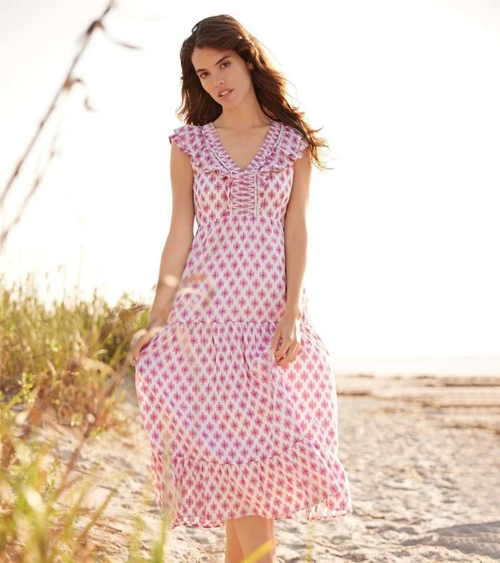 An empire waistline and tiered skirt give this midi dress a graceful fit and fluttery feel. The fully lined bodice flatters with two layers of ruffles meeting at the center V-neck, while the drapes are enhanced by soft smocking details at sides.