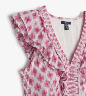 Bodice side panels are finished with elastic smocking