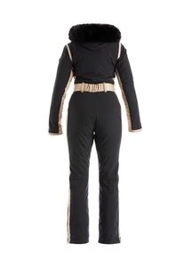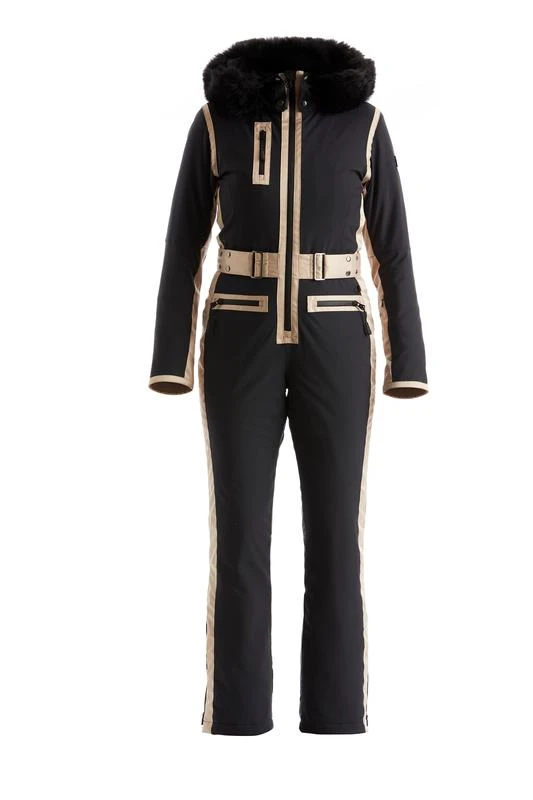 4 way stretch insulated one piece ski suit with helmet compatible hood, removable faux fur, interior and exterior pockets and adjustable belt. Waterproof/Breathable rating 20/20.
