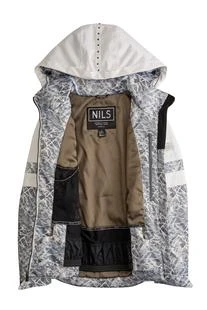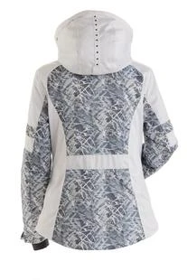 2 color hip length ski jacket with stripe detail at front chest and sleeves. Custom gunmetal hardware and YKK mirror-like zippers. Waterproof/ Breathable rating 20/20.